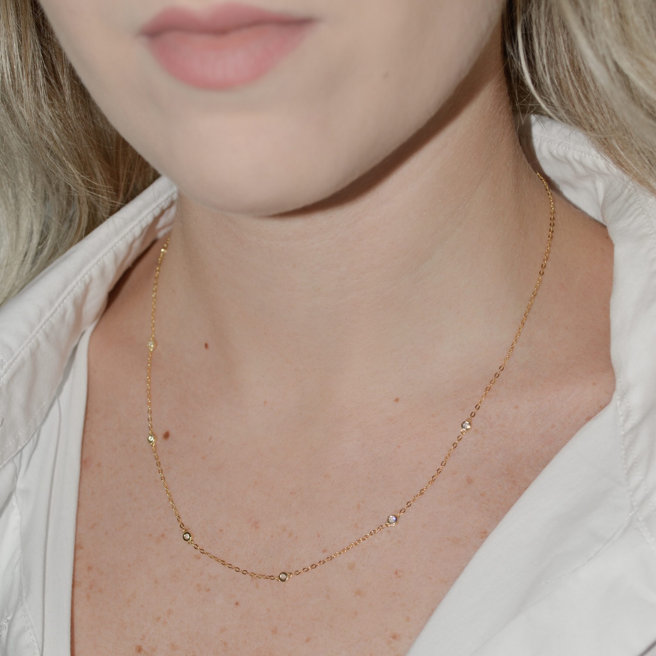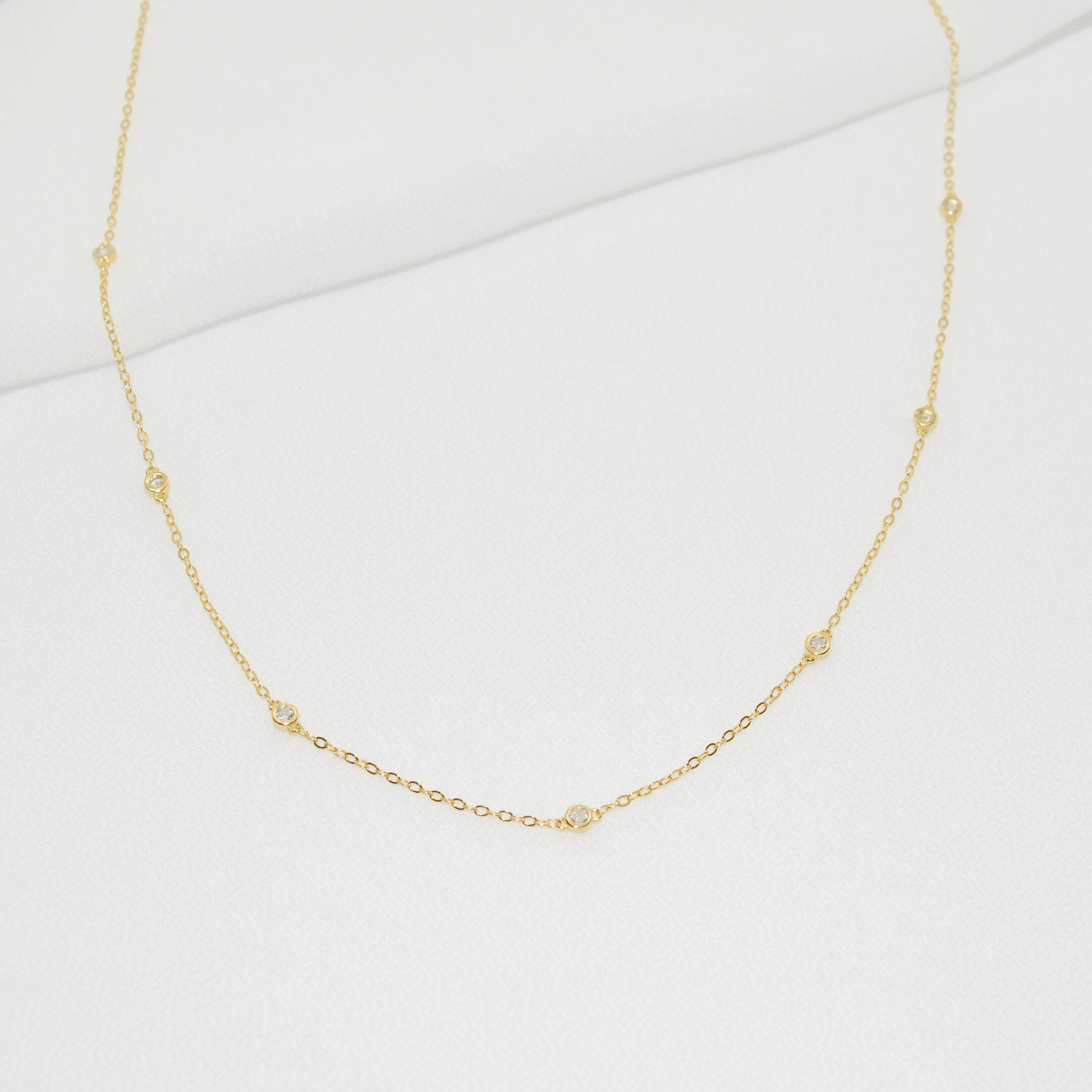 Minimalistična ogrlica z majhnimi cirkoni v obliki krogca. Izdelana je iz Srebra 925 oz. Sterling silver 925 in pozlačena z 18k zlatom. Ogrlica je hipoalergena, zato je primerna tudi za občutljivo kožo.