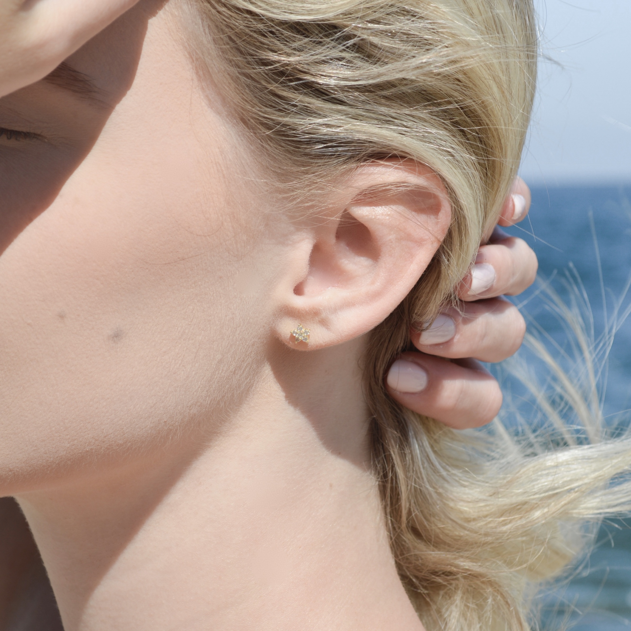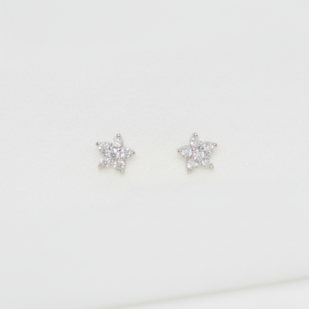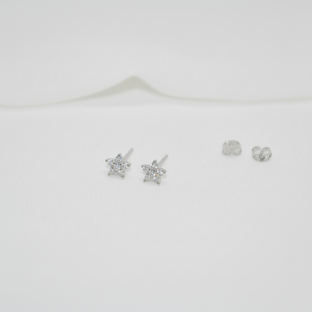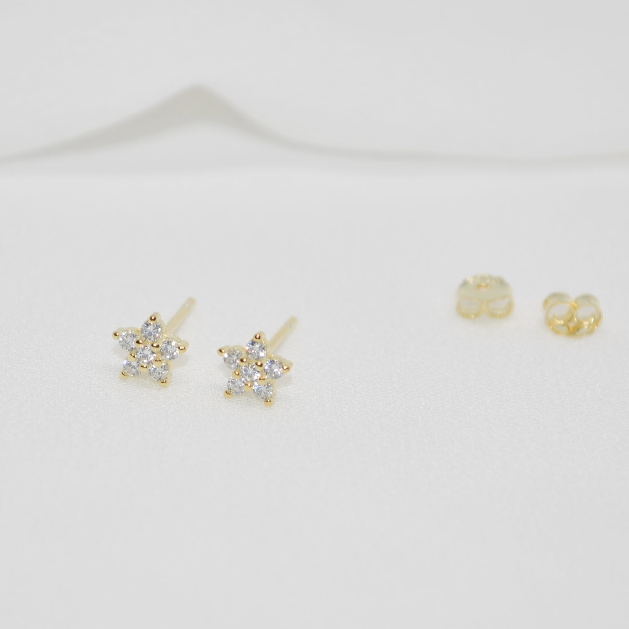 Minimalistični uhani v obliki rožic z majhnimi cirkoni. Izdelani so iz Srebra 925 oz. Sterling silver 925 in pozlačeni z 18k zlatom. Uhani so hipoalergeni, zato so primerni tudi za občutljivo kožo.