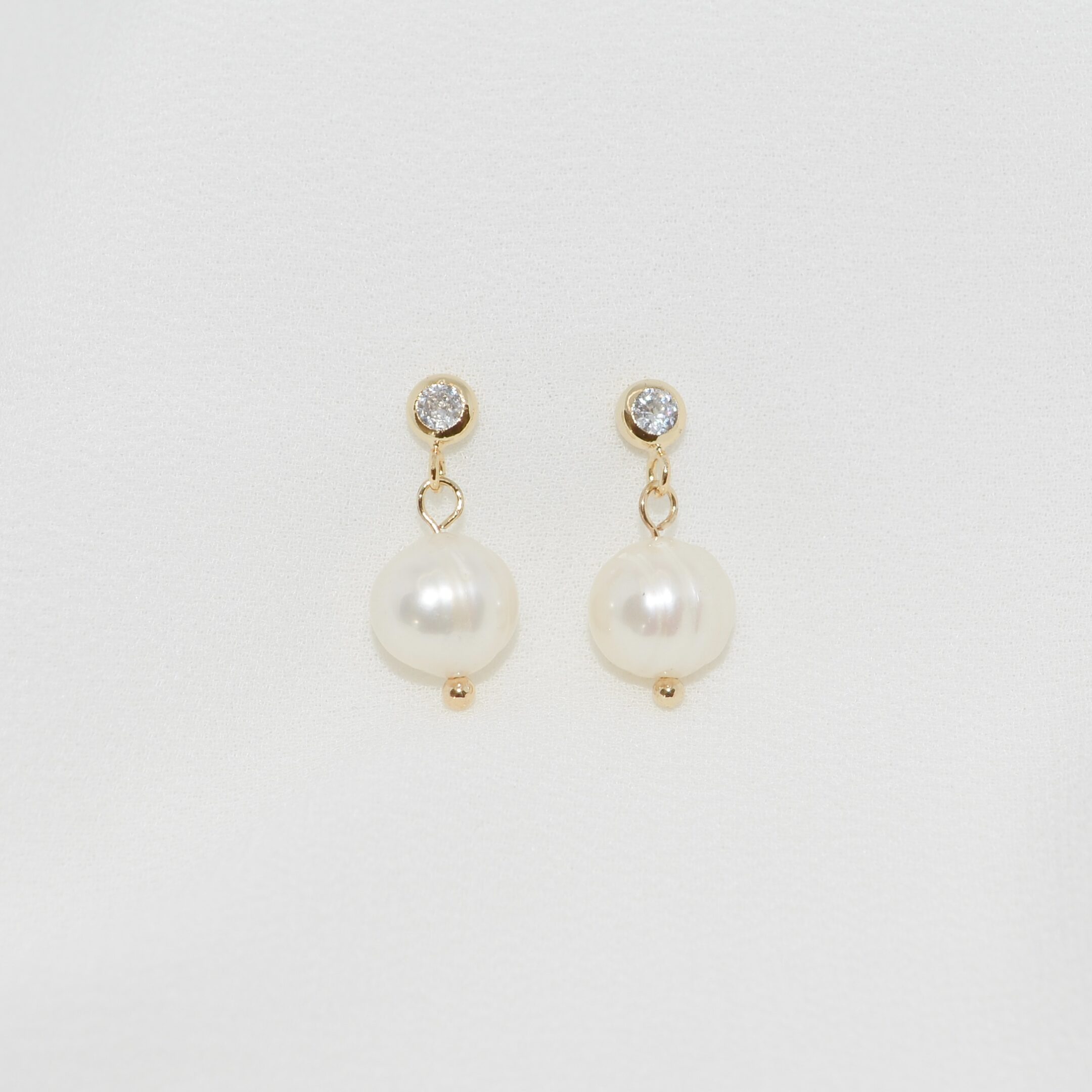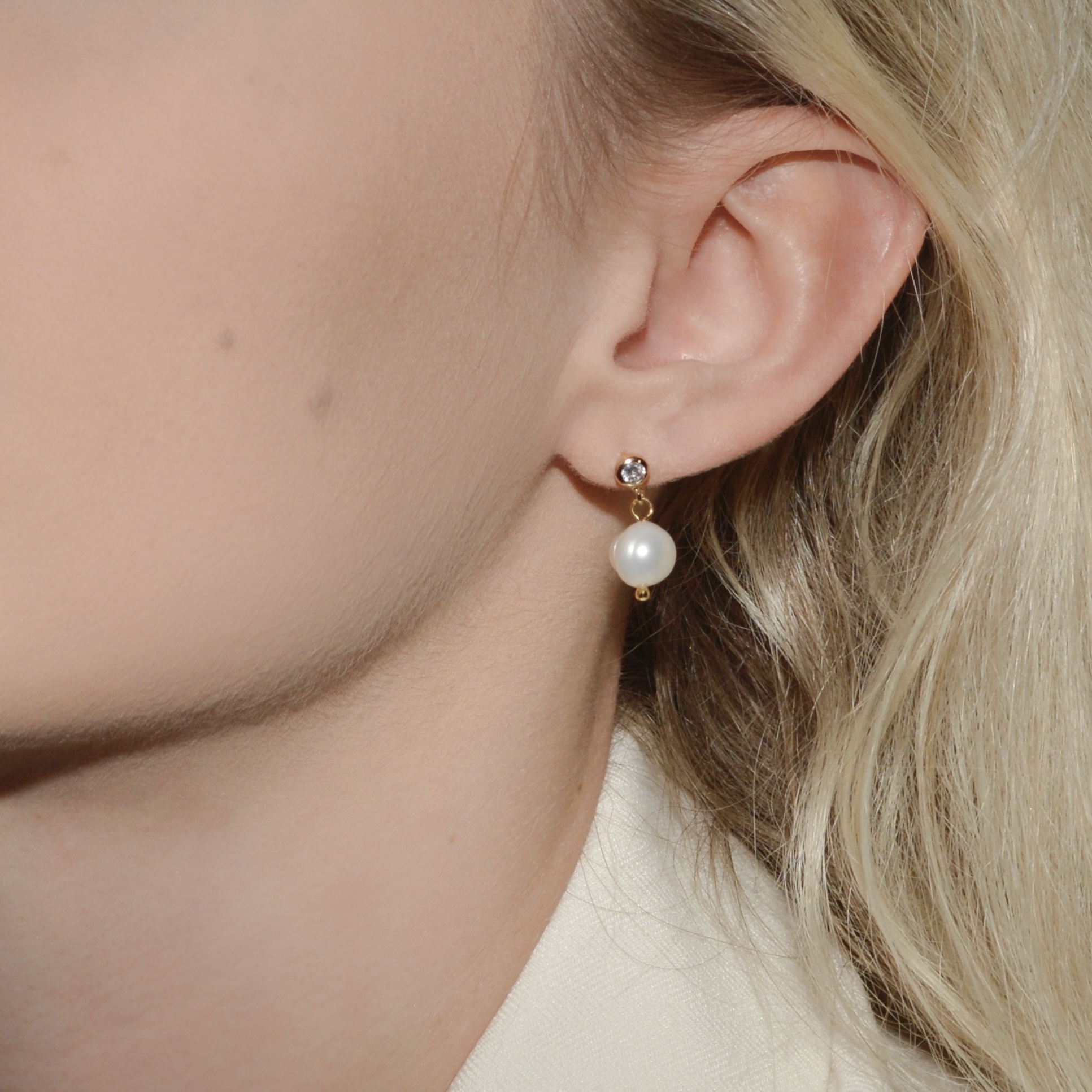 Ročno izdelani uhani z obeski pravih sladkovodnih biserov, so popoln kos, ki združuje nežnost, minimalizem in brezčasno eleganco. Uhani so izdelani iz nerjavečega jekla in pozlačeni z 18k zlatom. Majhni cirkoni na ušesni zaponki uhanom dodajo čudovit sijaj.