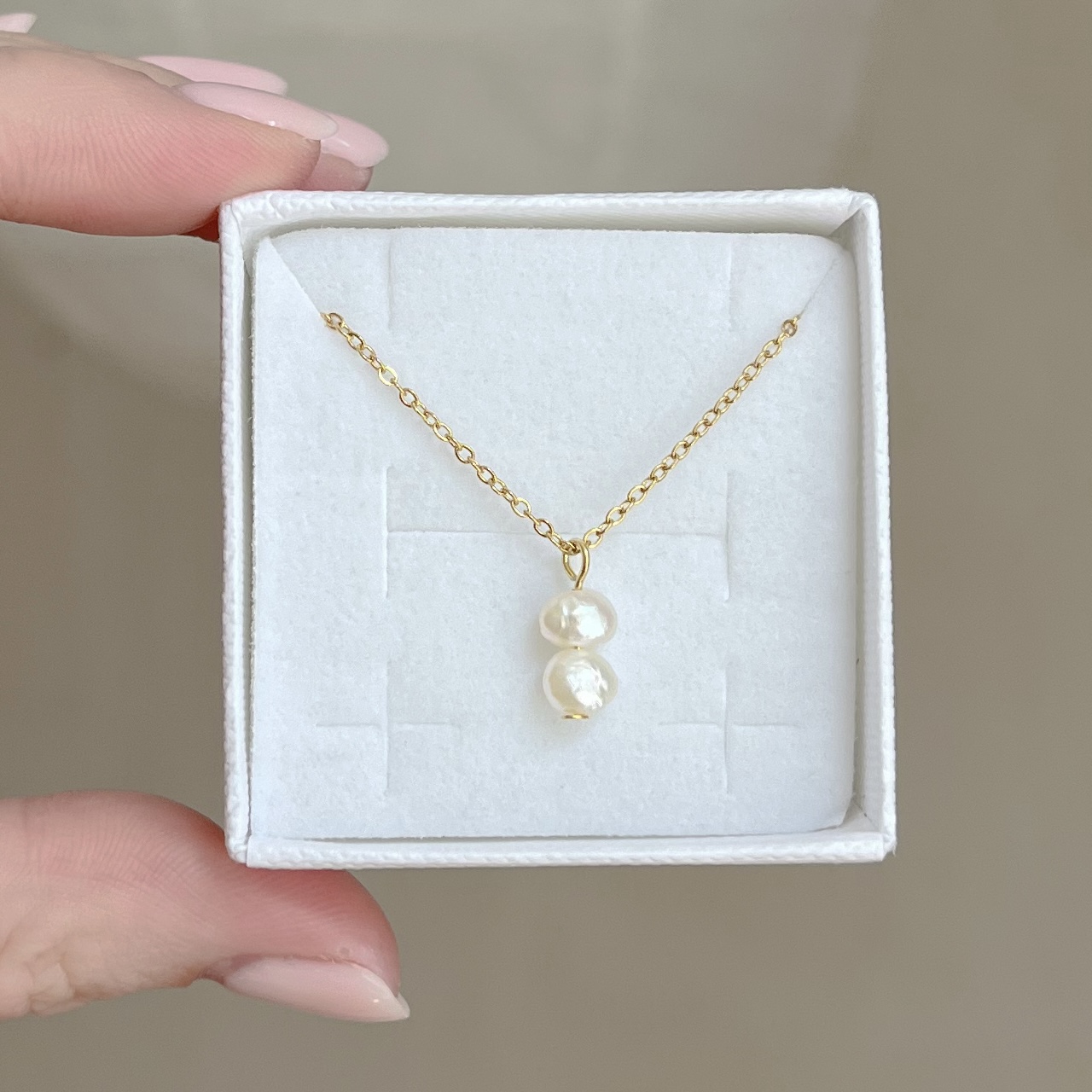 Ročno izdelana ogrlica z obeskom pravih biserov. Ogrlica je narejena iz nerjavečega jekla in pozlačena z 18k zlatom.