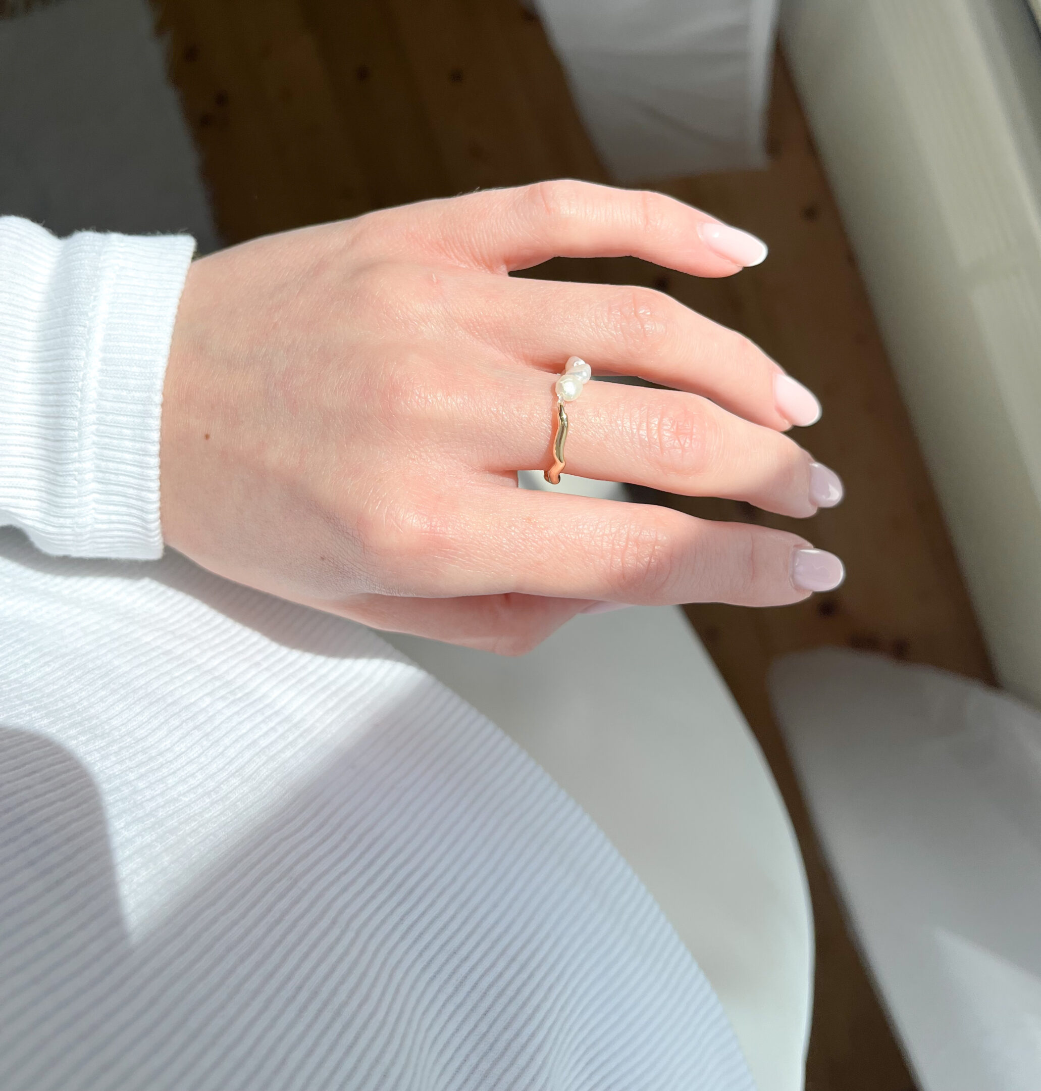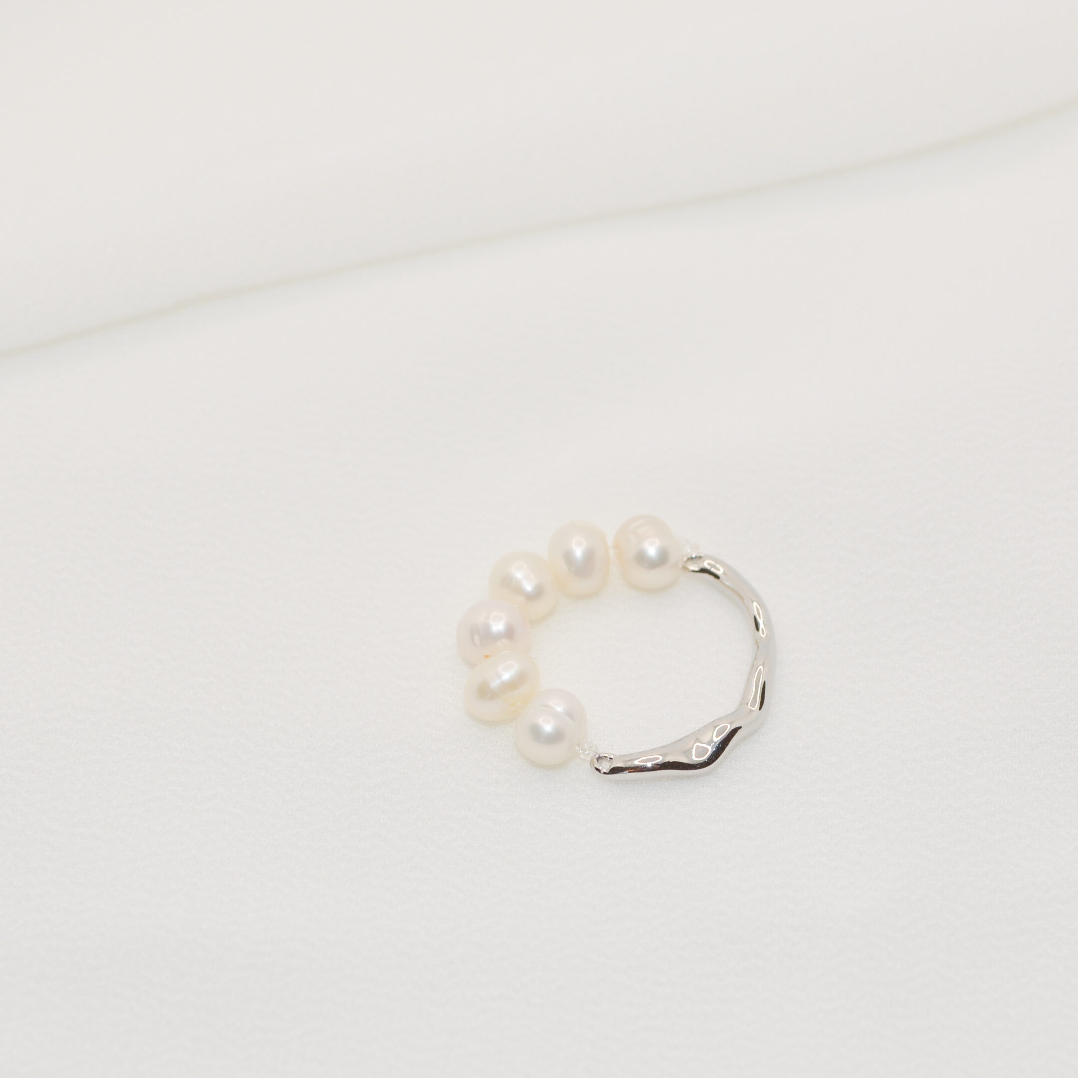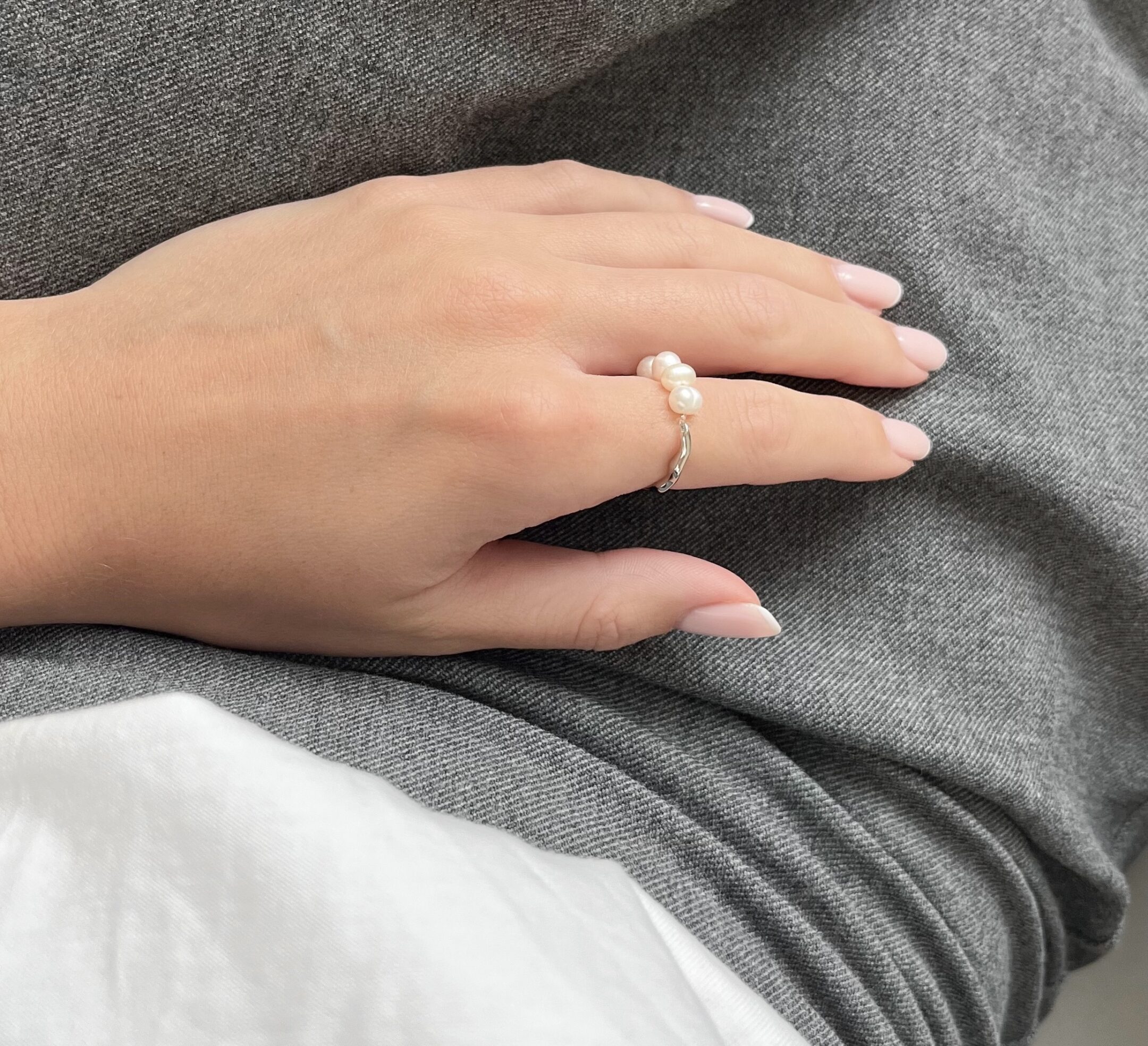 Posebnost prstana je, da je izdelan iz dveh materialov, zato ga lahko nosite na strani biserov ali na srebrni valoviti strani. Je zelo nežen in minimalističen, zato je primerna izbira za vsak stil. Je raztegljiv, lahek in zelo prijeten za nošnjo.