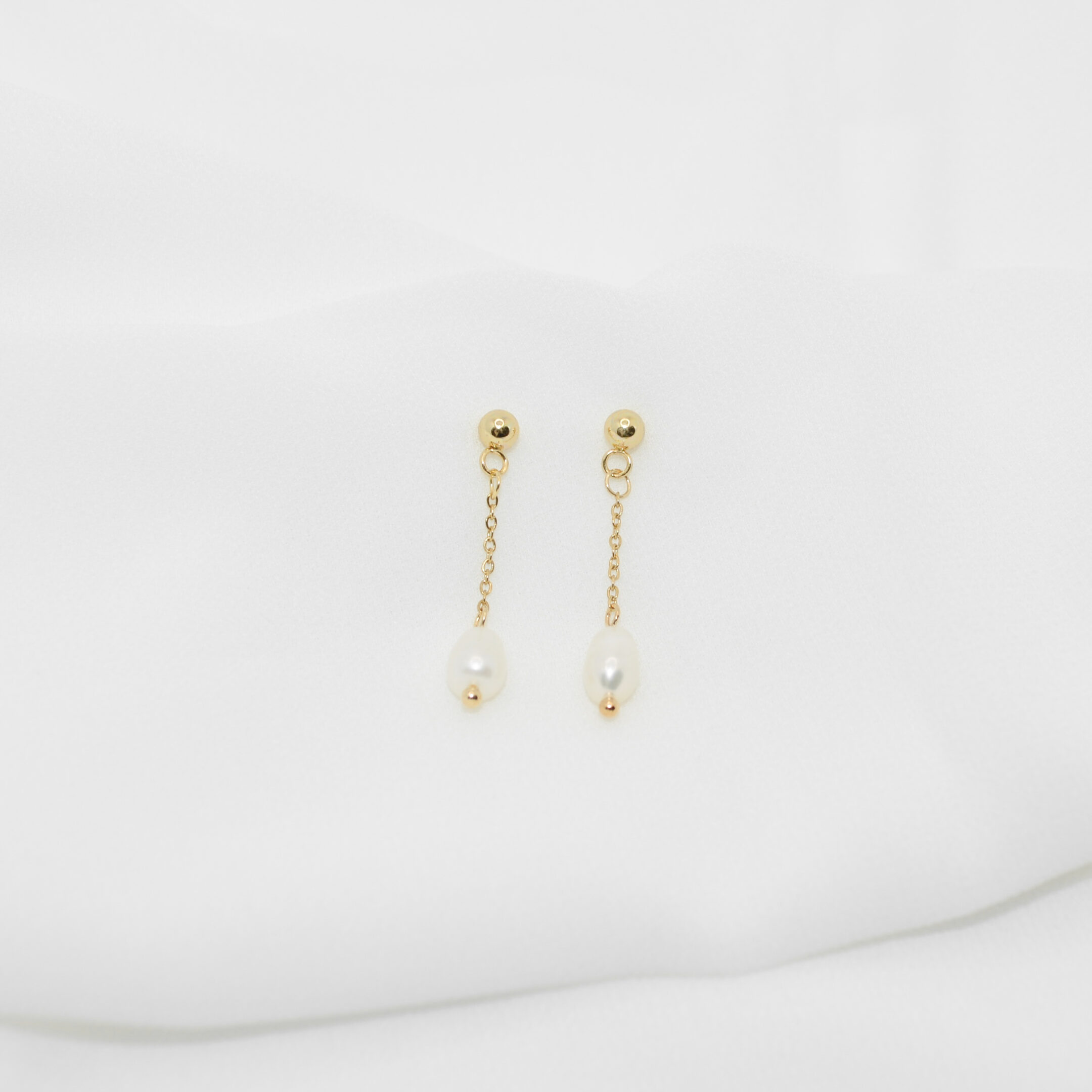 Ročno izdelani uhani s pravimi sladkovodnimi biseri na podaljšanem obesku, so popoln kos, ki združuje nežnost, minimalizem in brezčasno eleganco. Uhani so izdelani iz nerjavečega jekla in pozlačeni z 18 / 24k zlatom.