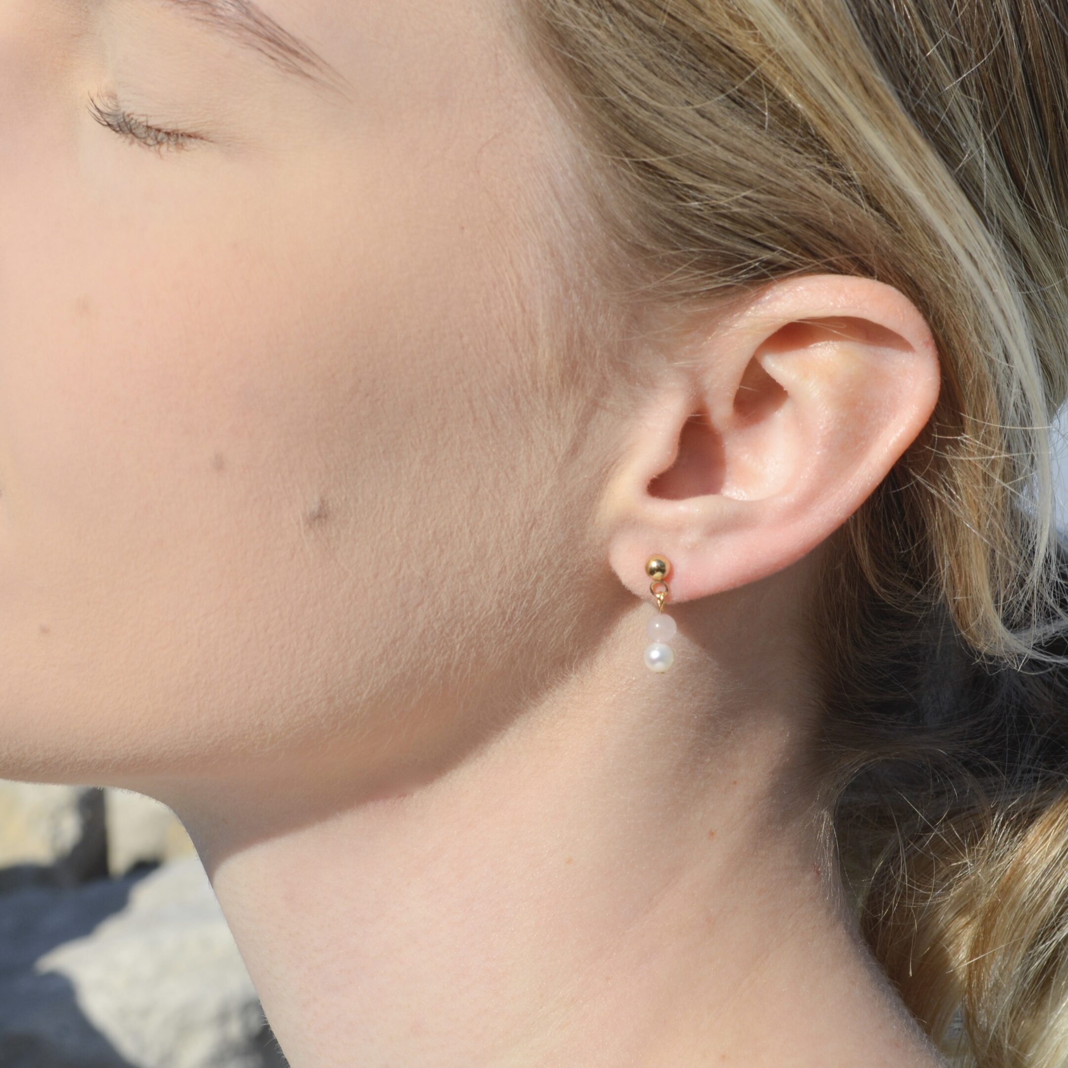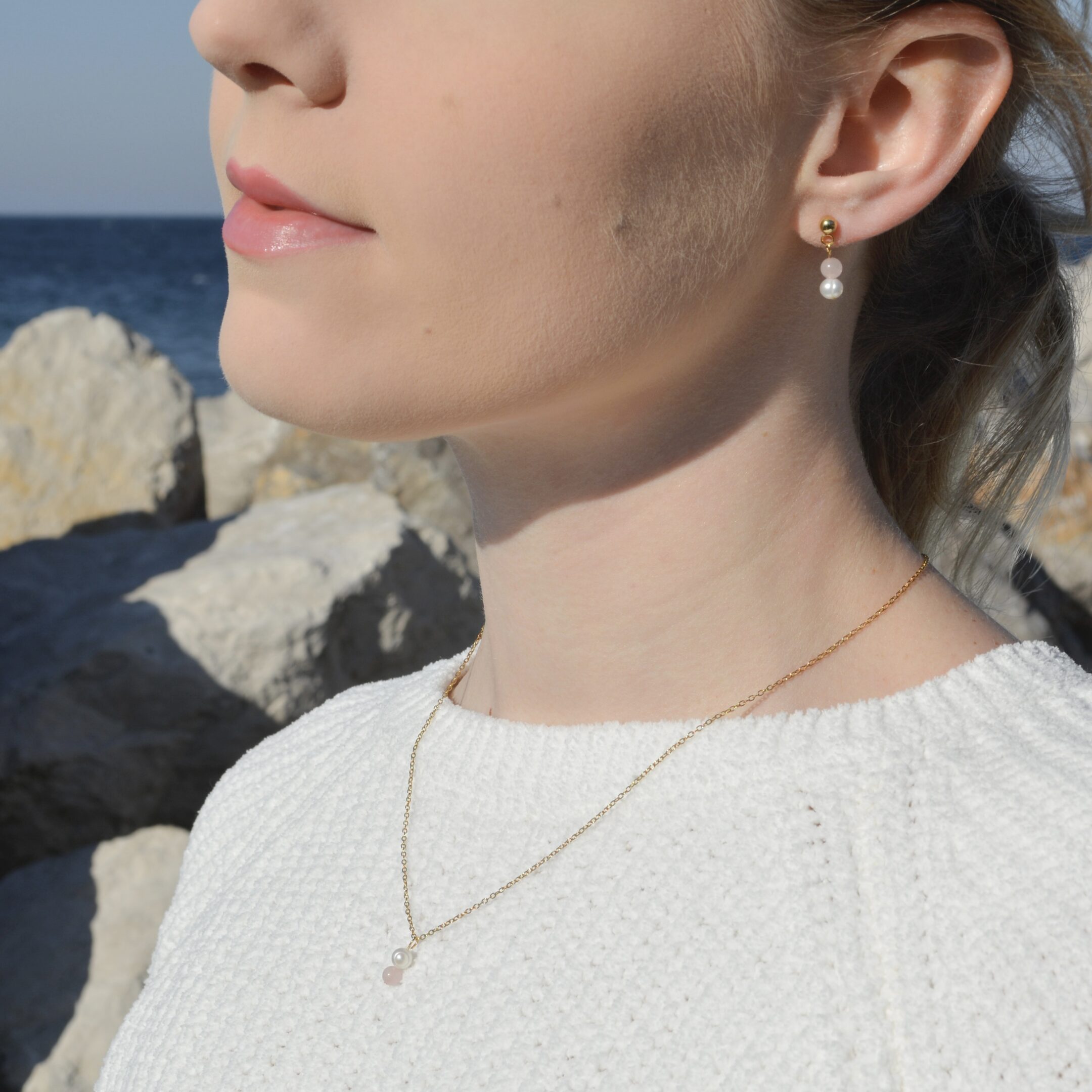 Ročno izdelan komplet z naravnim poldragim kamnom Roževcem, ki simbolizira ljubezen in prijateljstvo in pravimi sladkovodnimi biseri. Ogrlica in uhani so narejeni iz nerjavečega jekla. Ogrlica je pozlačena z 18k zlatom in uhani z 24k zlatom.